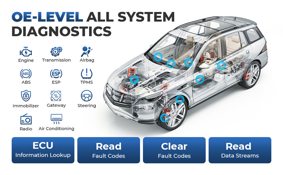 5. OE-level system diagnosis allows customers to deeply understand the vehicle systems of more than 200 models including engine, transmission, airbag, ABS, ESP, and TPMS, compatible with GM, Ford, Chrysler, BNEZ, BMW, etc.