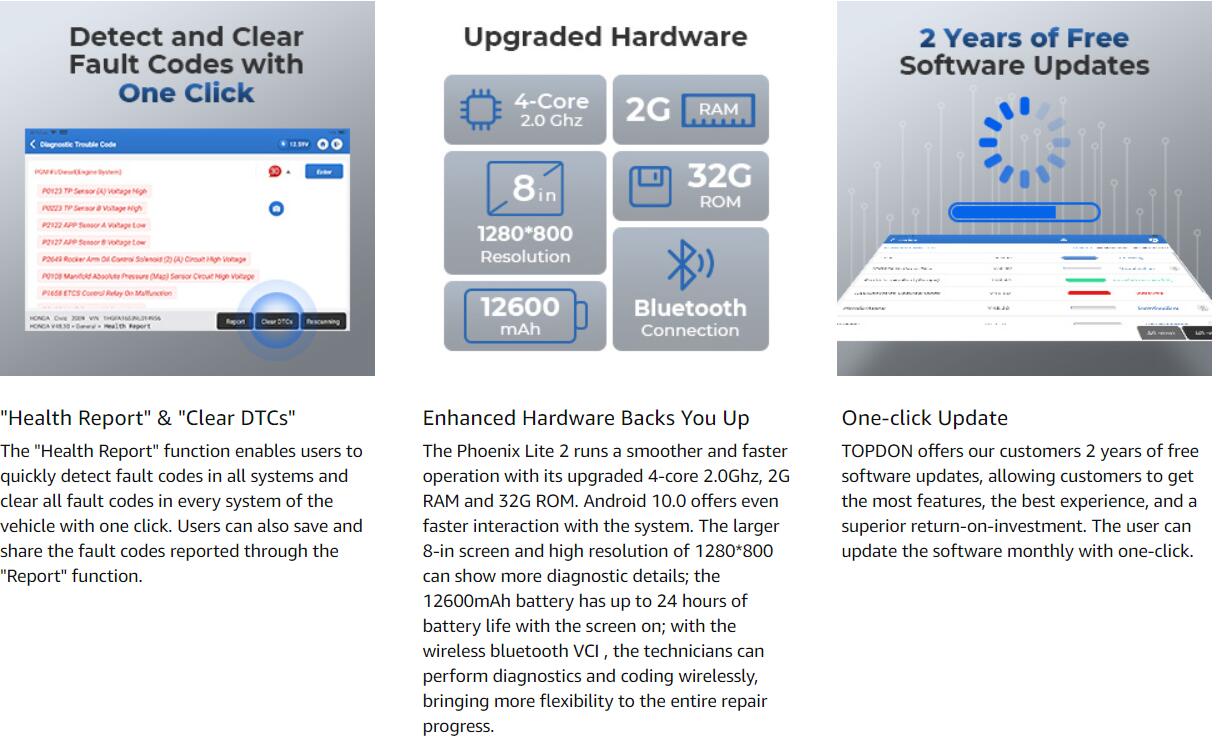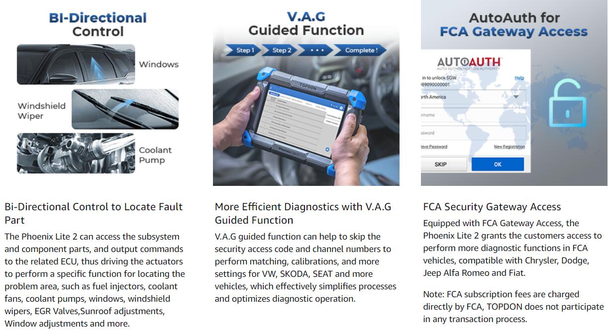 TOPDON Phoenix Lite2 is an OE level car diagnostic tool, it can support ONLINE/ECU CODING For VEHICLE MODIFICATION, 200 models OE level diagnostics, 28+ RESET SERVICE, V.A.G guidance function, BI-DIRECTIONAL CONTROL, AUTOAUTH FOR FCA GATEWAY ACCESS.